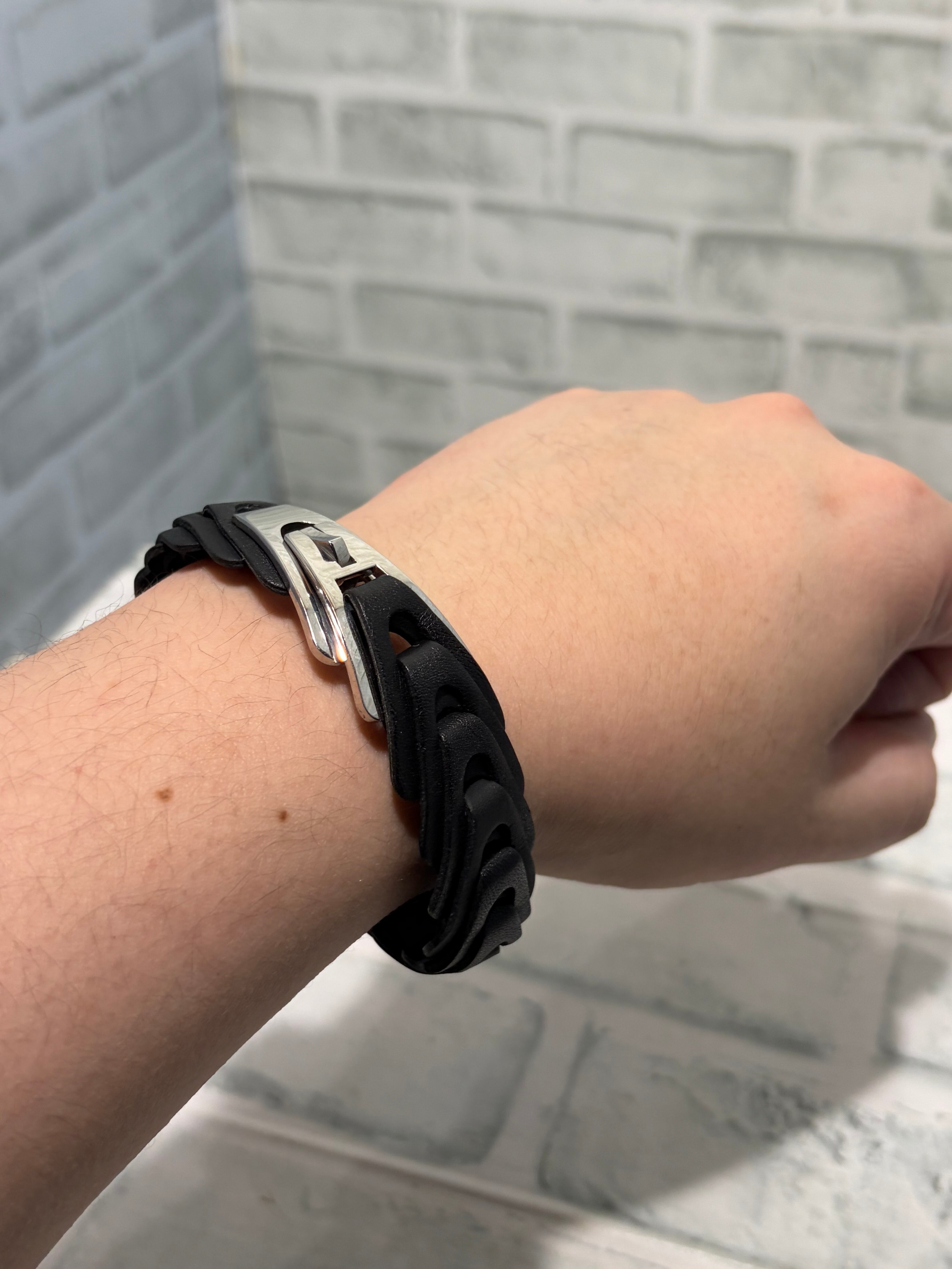 魚の背骨をモチーフにしたフィッシュボーンデザインのレザーブレスレット。金具を含めて均一にデザインされた上品なアイテムです。