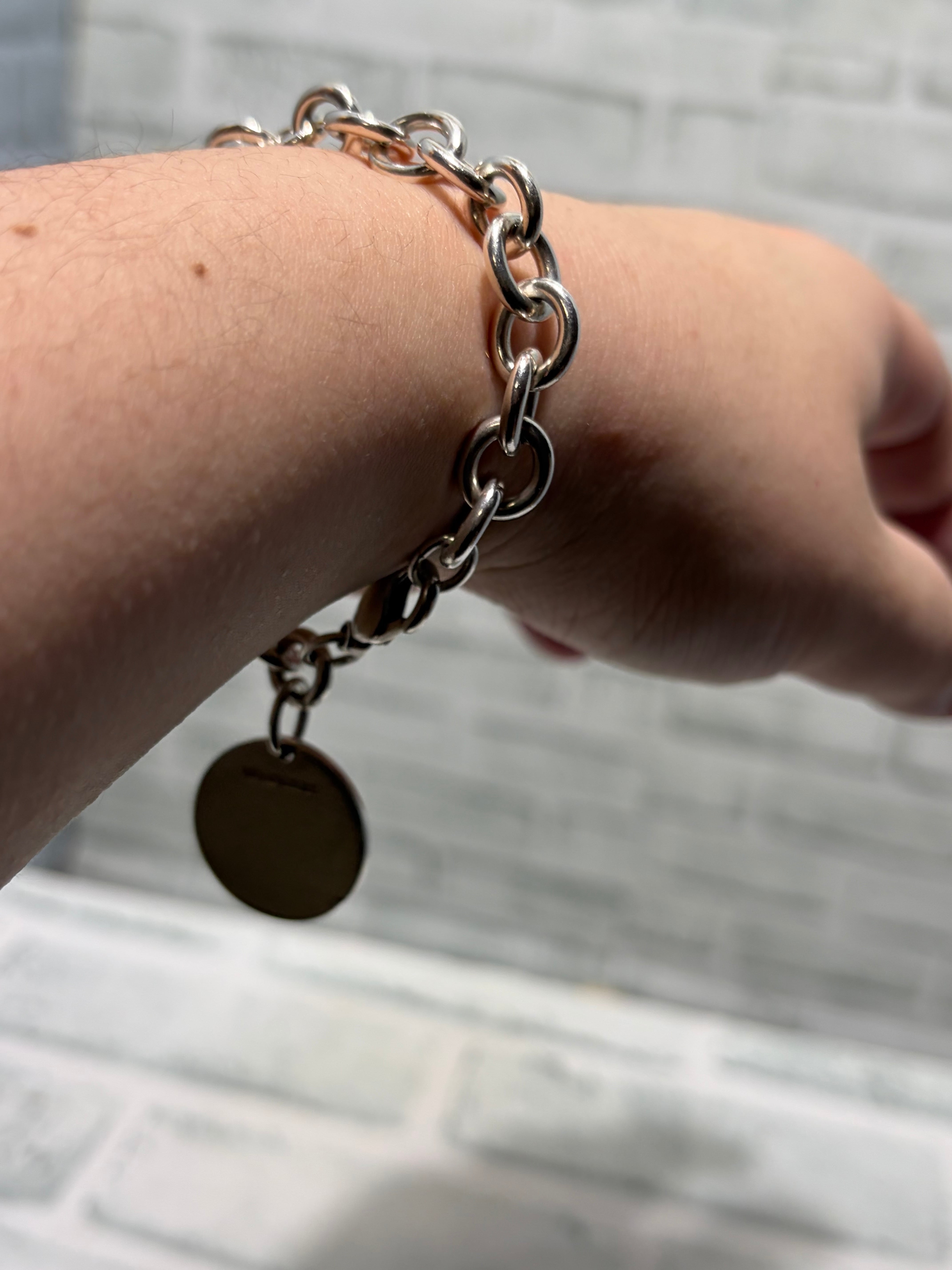 人気の高いオーバルデザインのリンクチェーンブレスレットにラウンドチャームが施されたブレスレット。