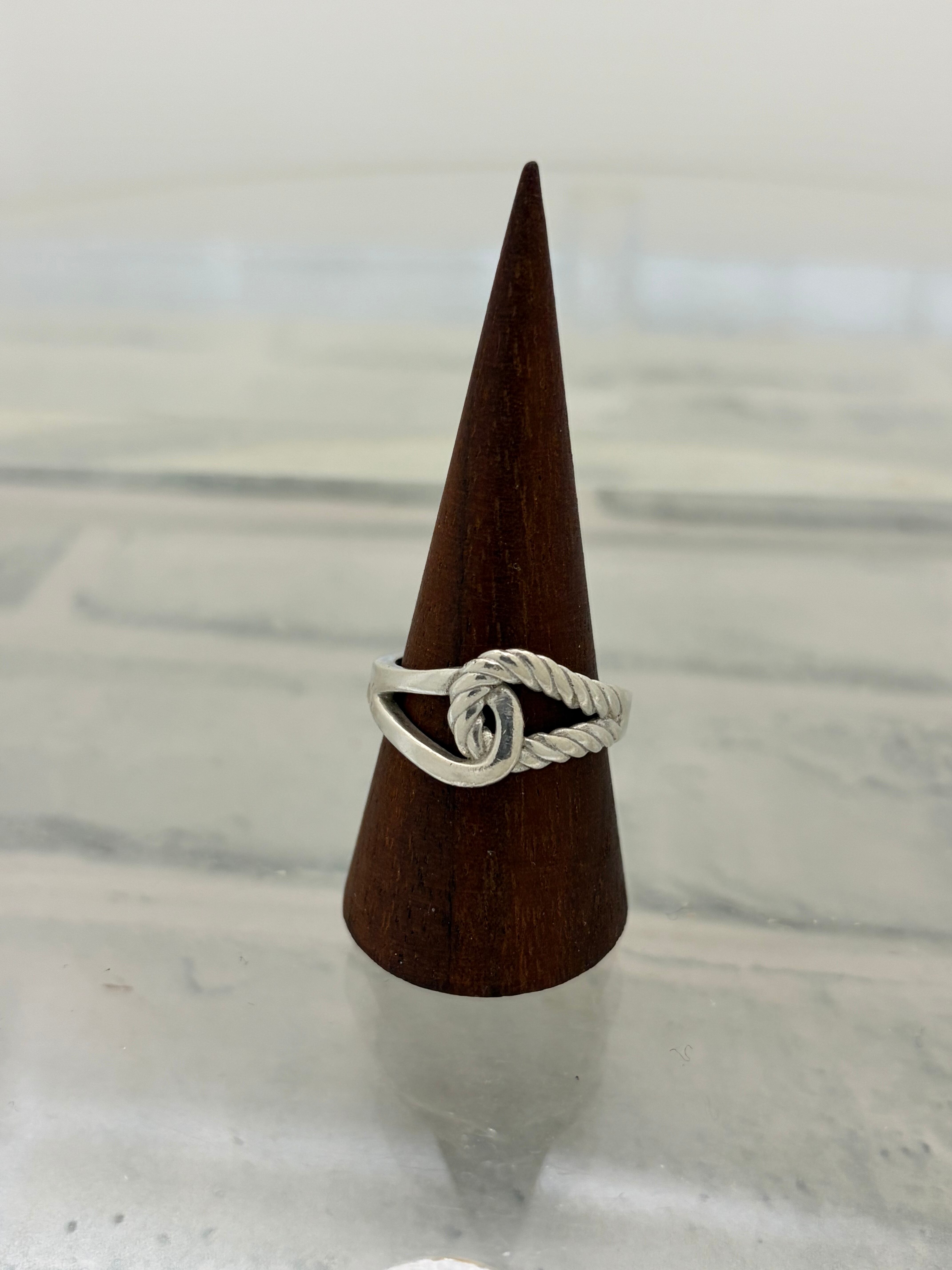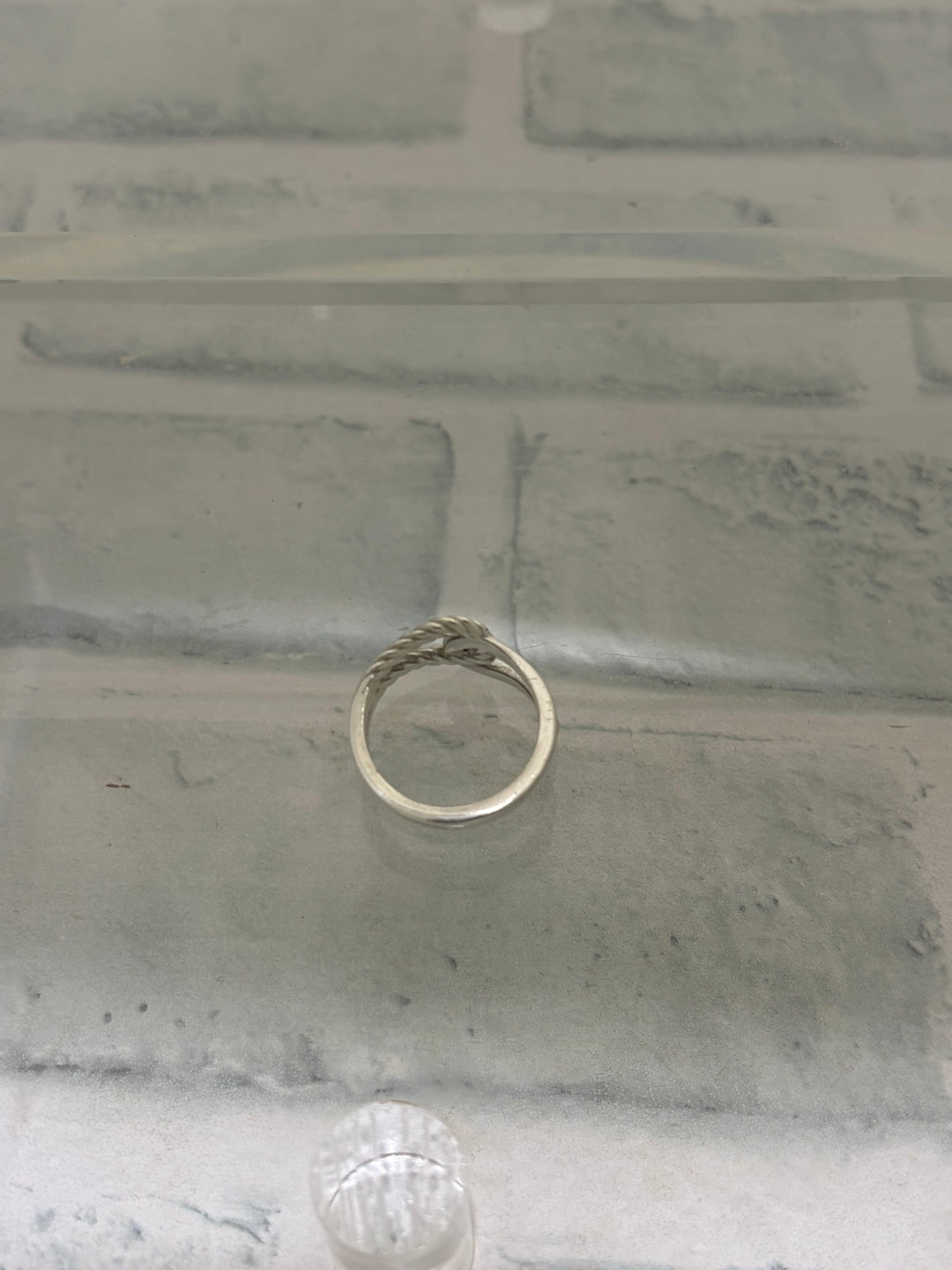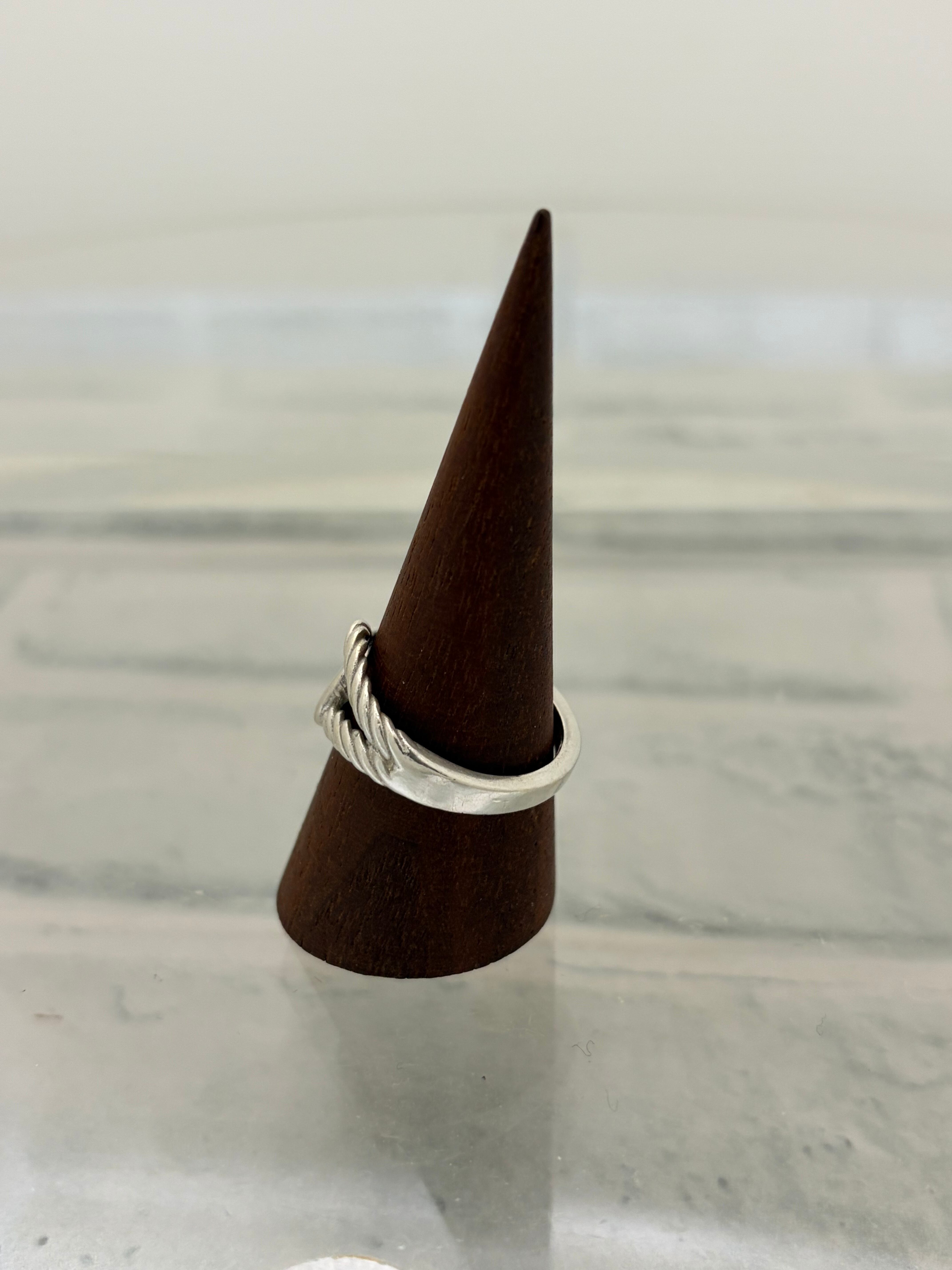 左右から伸びるループモチーフが重なり合ったデザインのリング。片方にだけツイストデザインが施されたアシンメトリーデザインが特徴的。