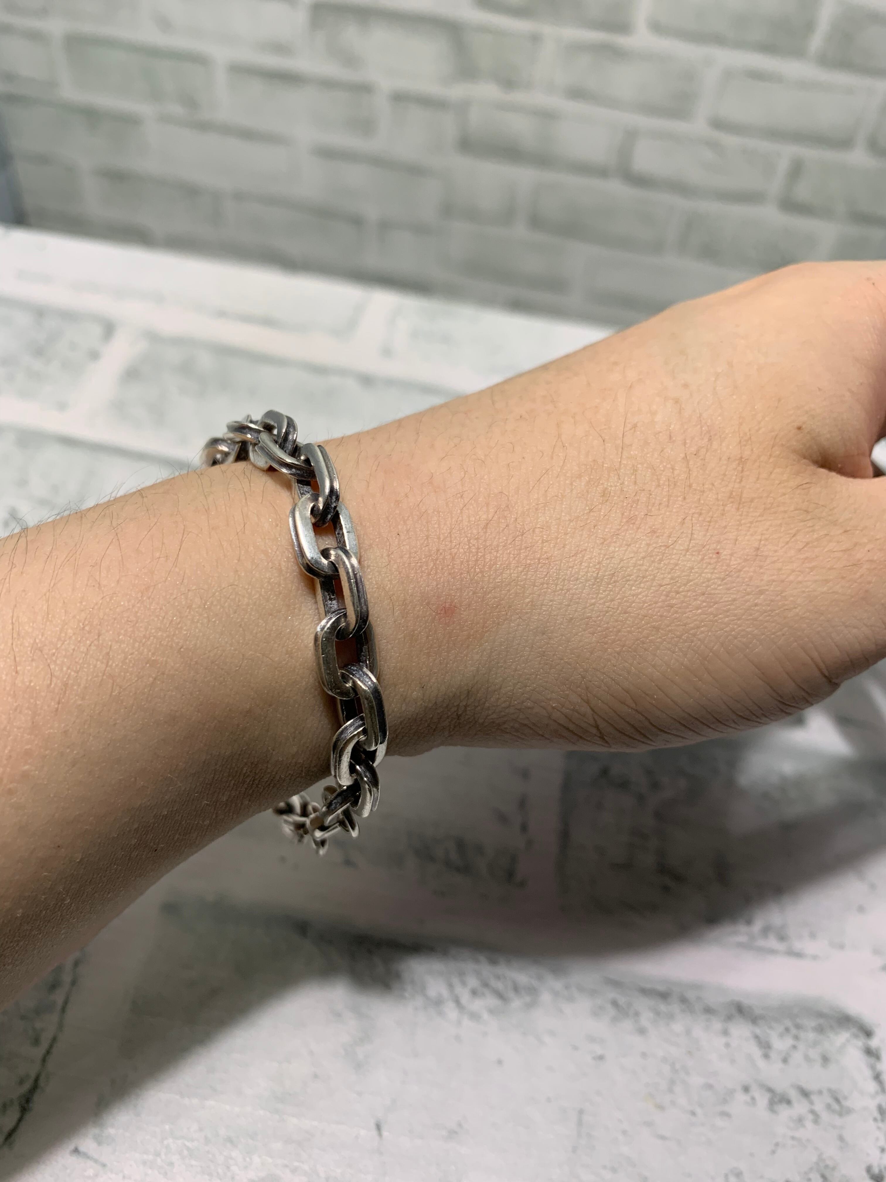 縦長のコマが特徴的なエリプスチェーンブレスレット。シンプルなモダンデザインから人気の高い一品。こちらのアイテムはコマのサイドの溝に燻し加工が施されて、凹凸感のあるデザインに仕上がっています。