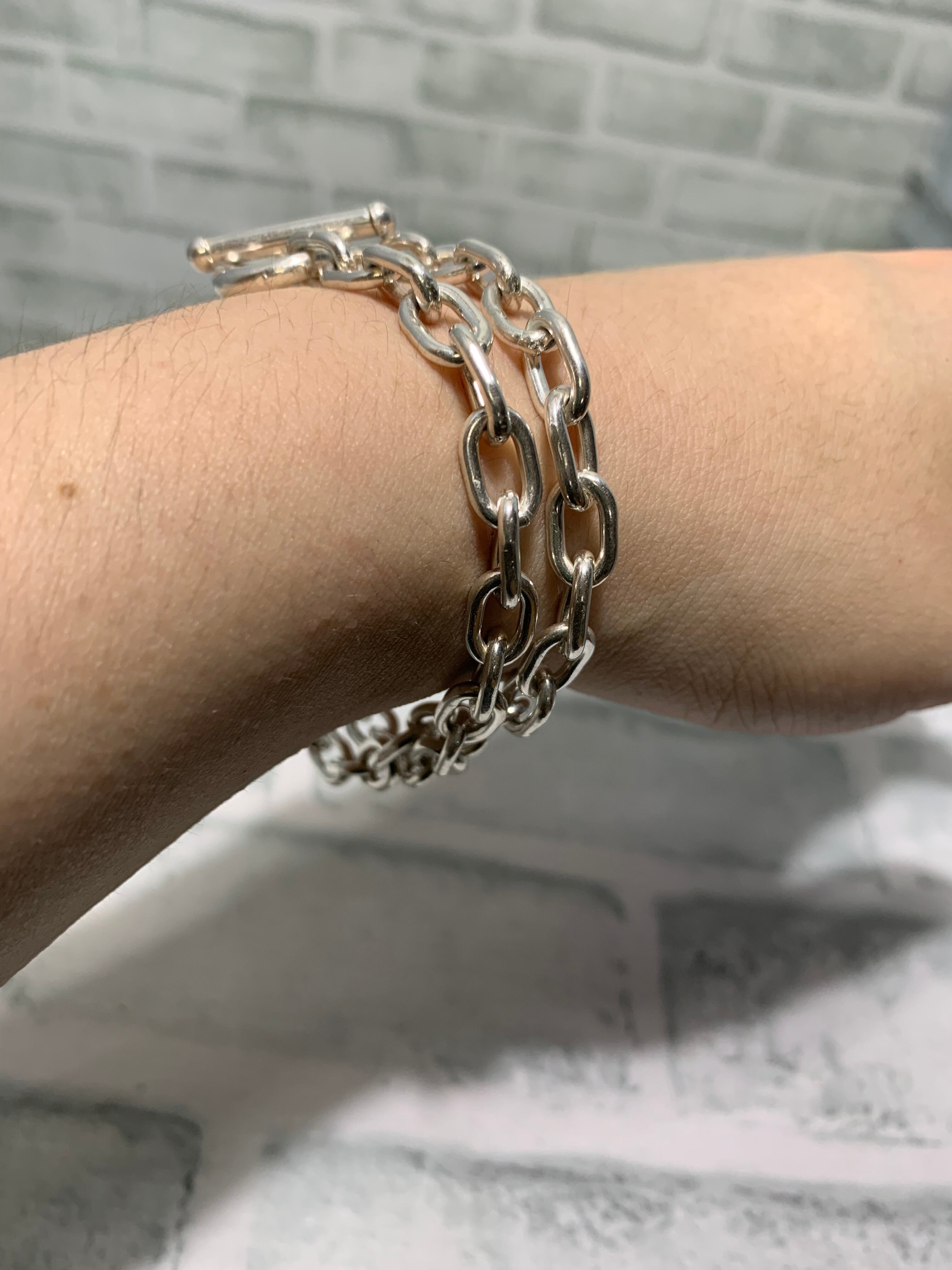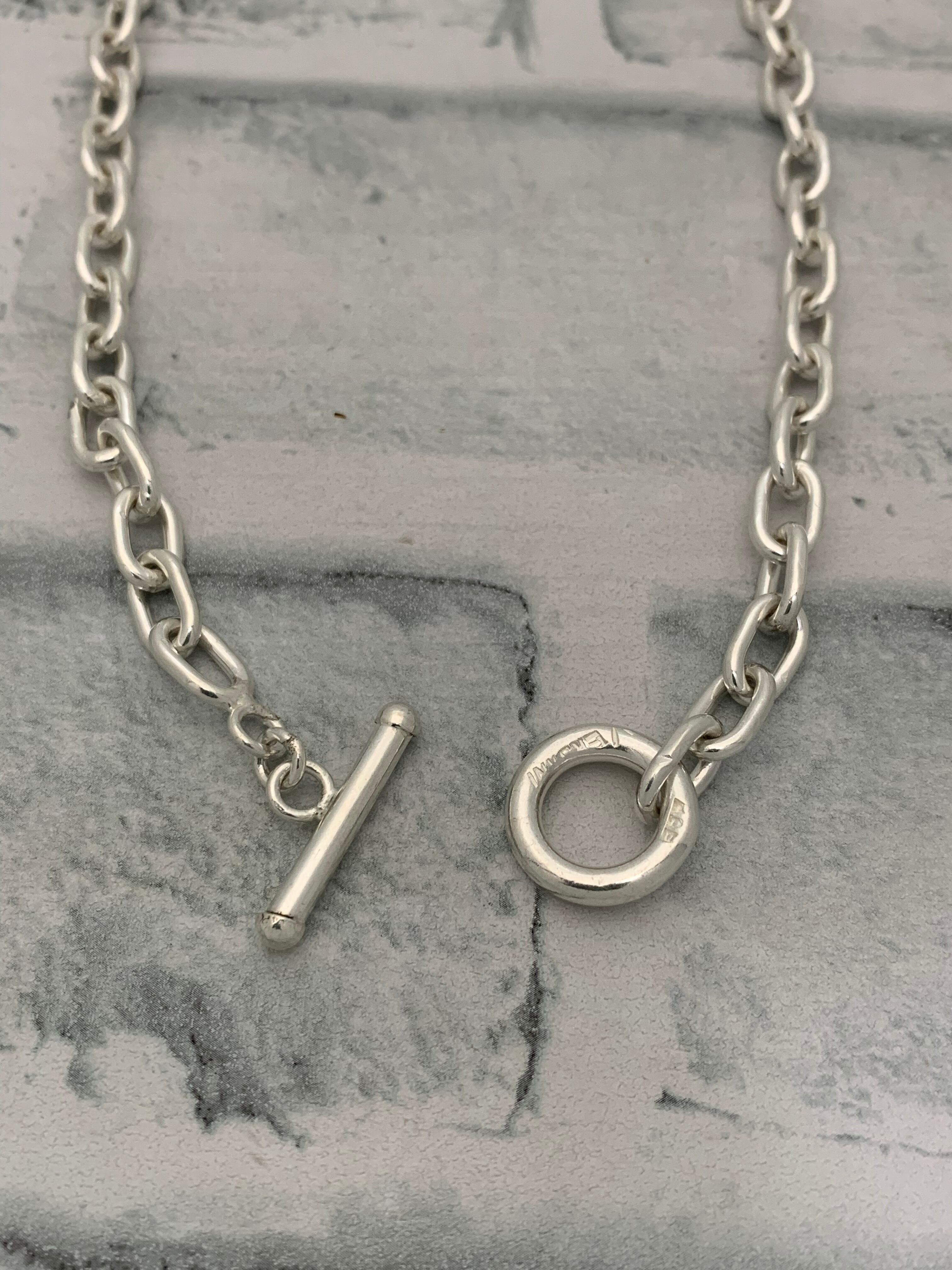 シンプルなリンクチェーンネックレス。人気の高いトグルデザインの金具なので着脱が楽かつデザインのアクセントになります。