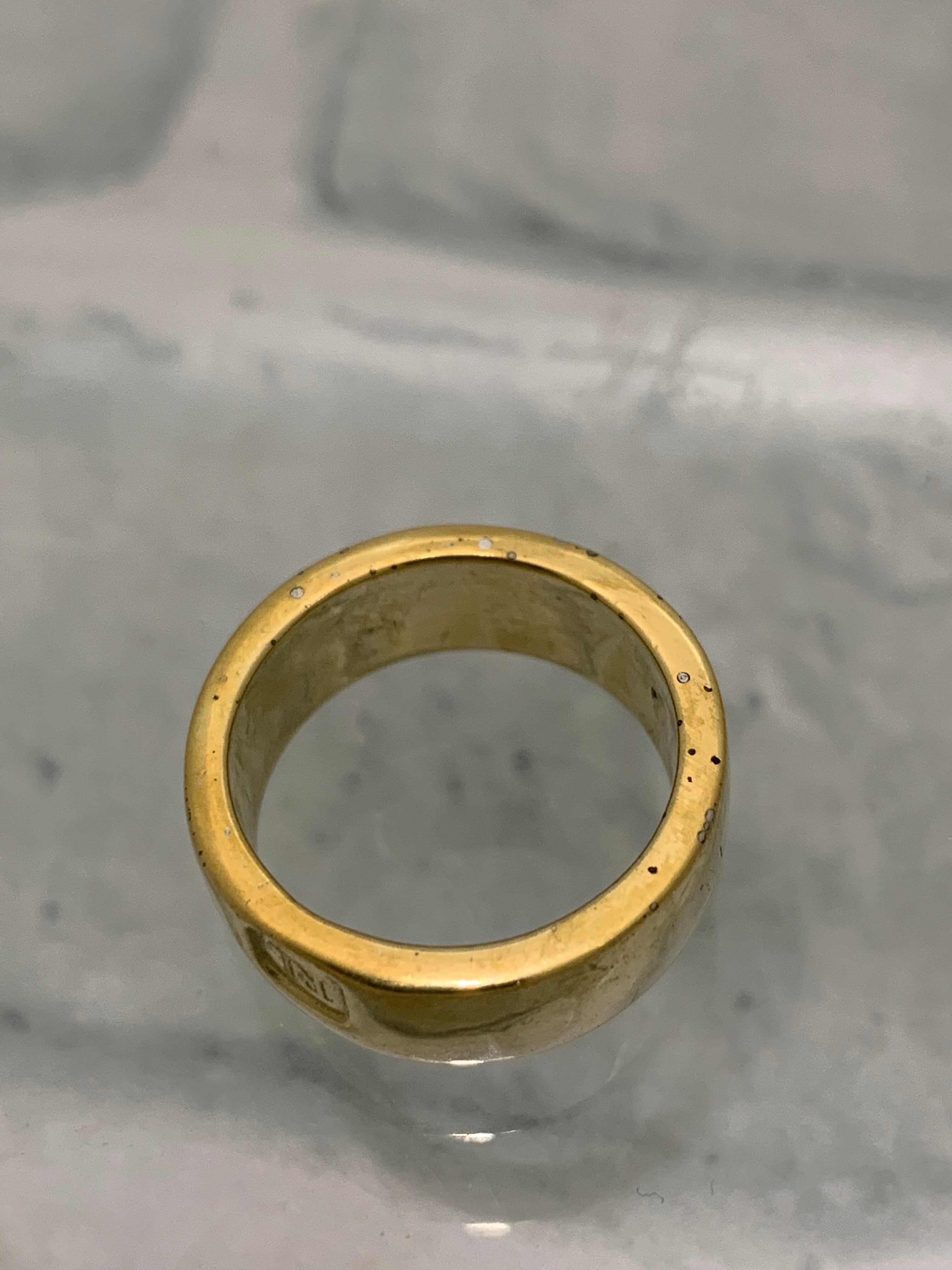 厚みのあるシンプルなバンドリングにロゴのホールマークがデザインされたリング。