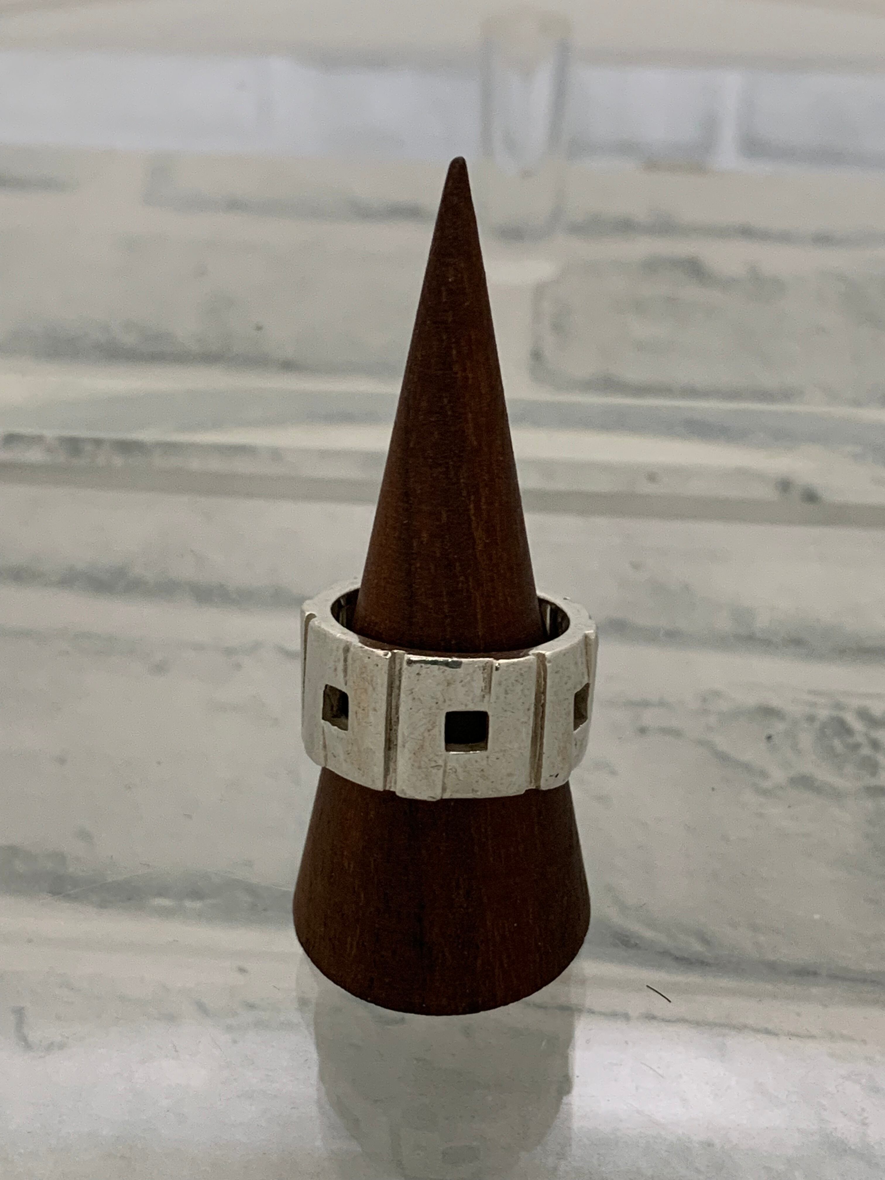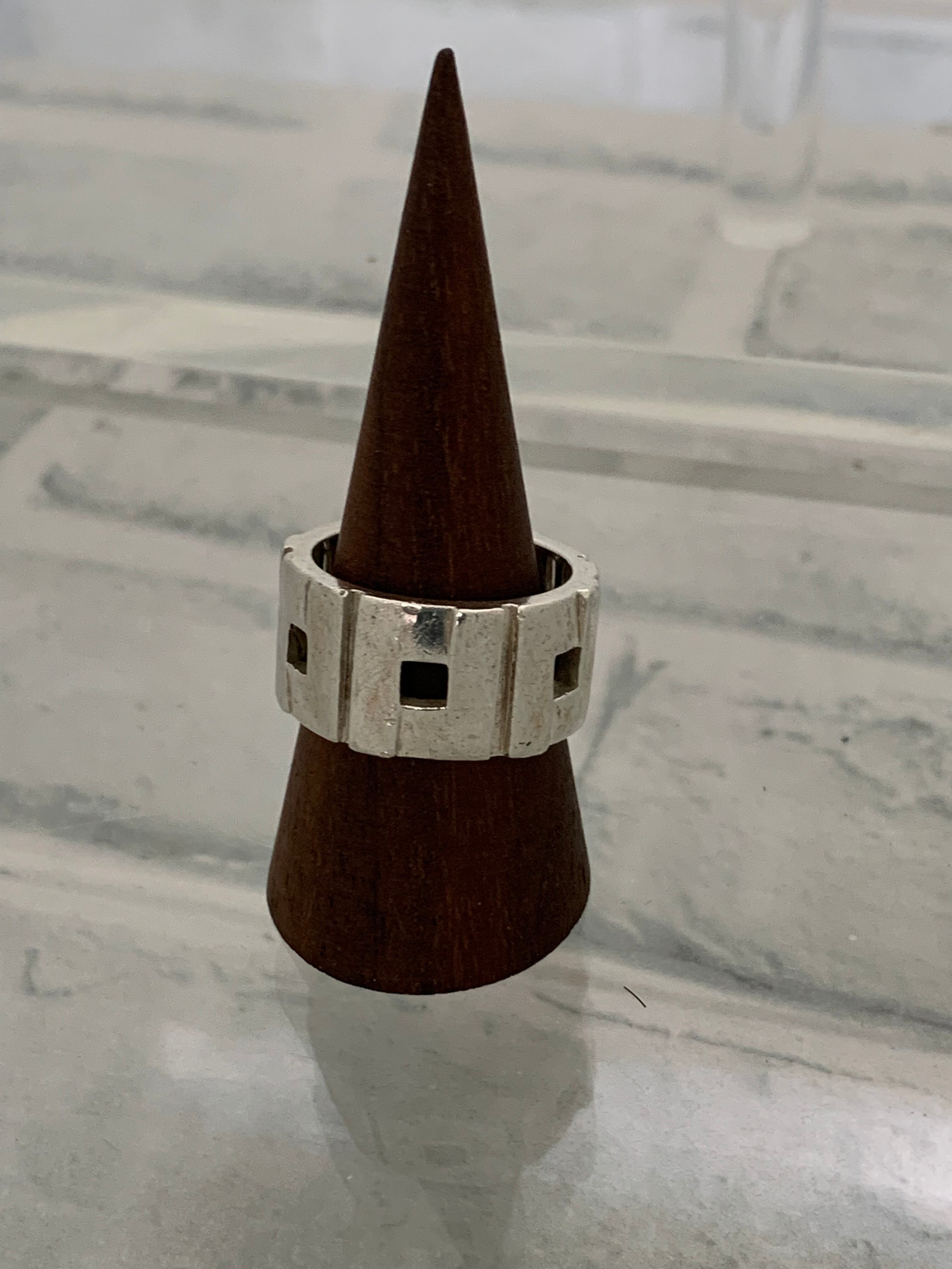 昔のグッチらしい鋭角にデザインされたGモチーフが全面に施されたワイドバンドリング。ジオメトリックの様な現代的雰囲気のあるアイテムです。