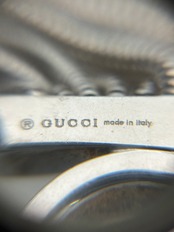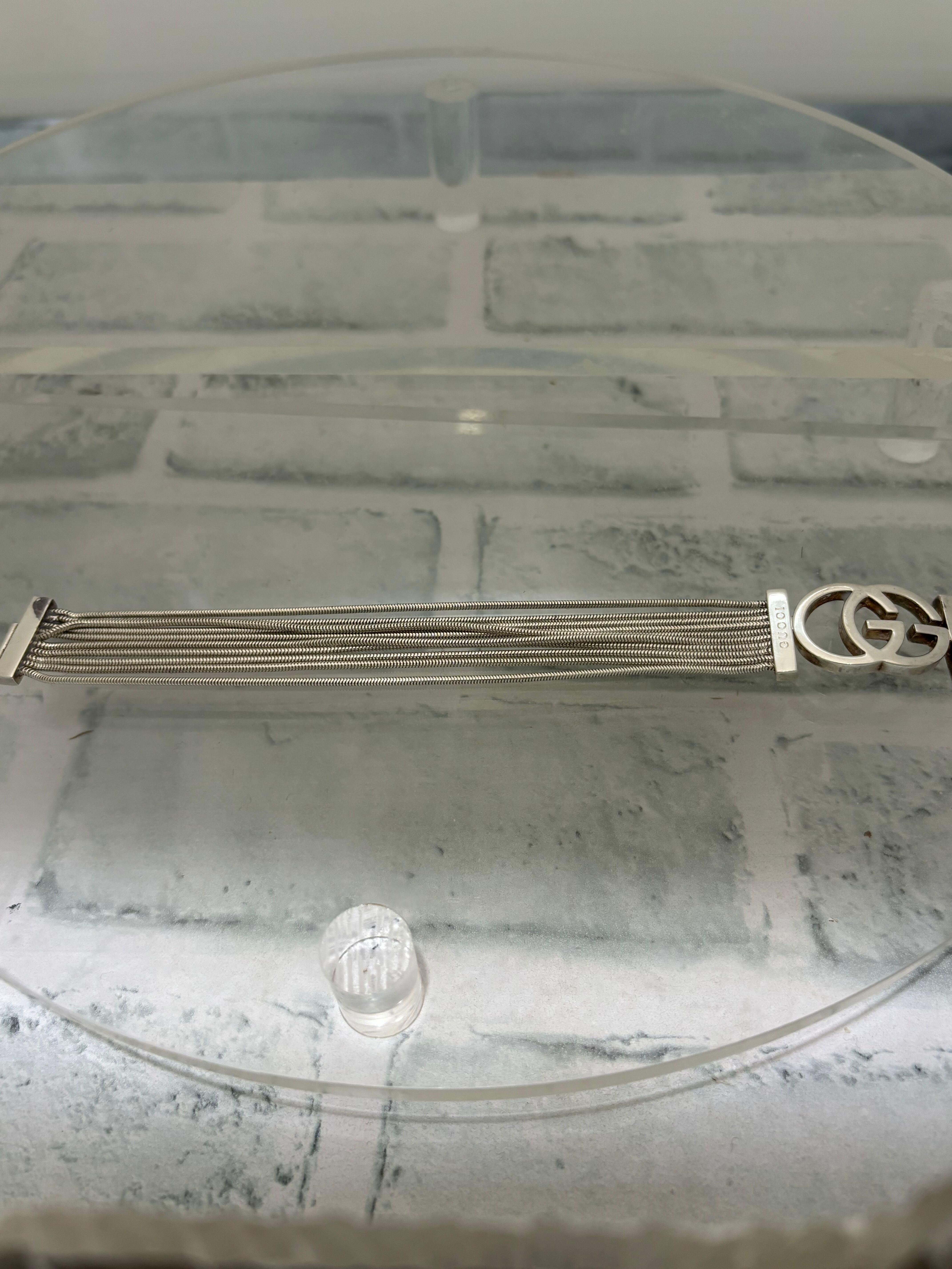 蛇腹をモチーフにしたスネークチェーンの10連デザインに、バックルを彷彿とさせる部分には大きくGGのロゴがデザインされています。