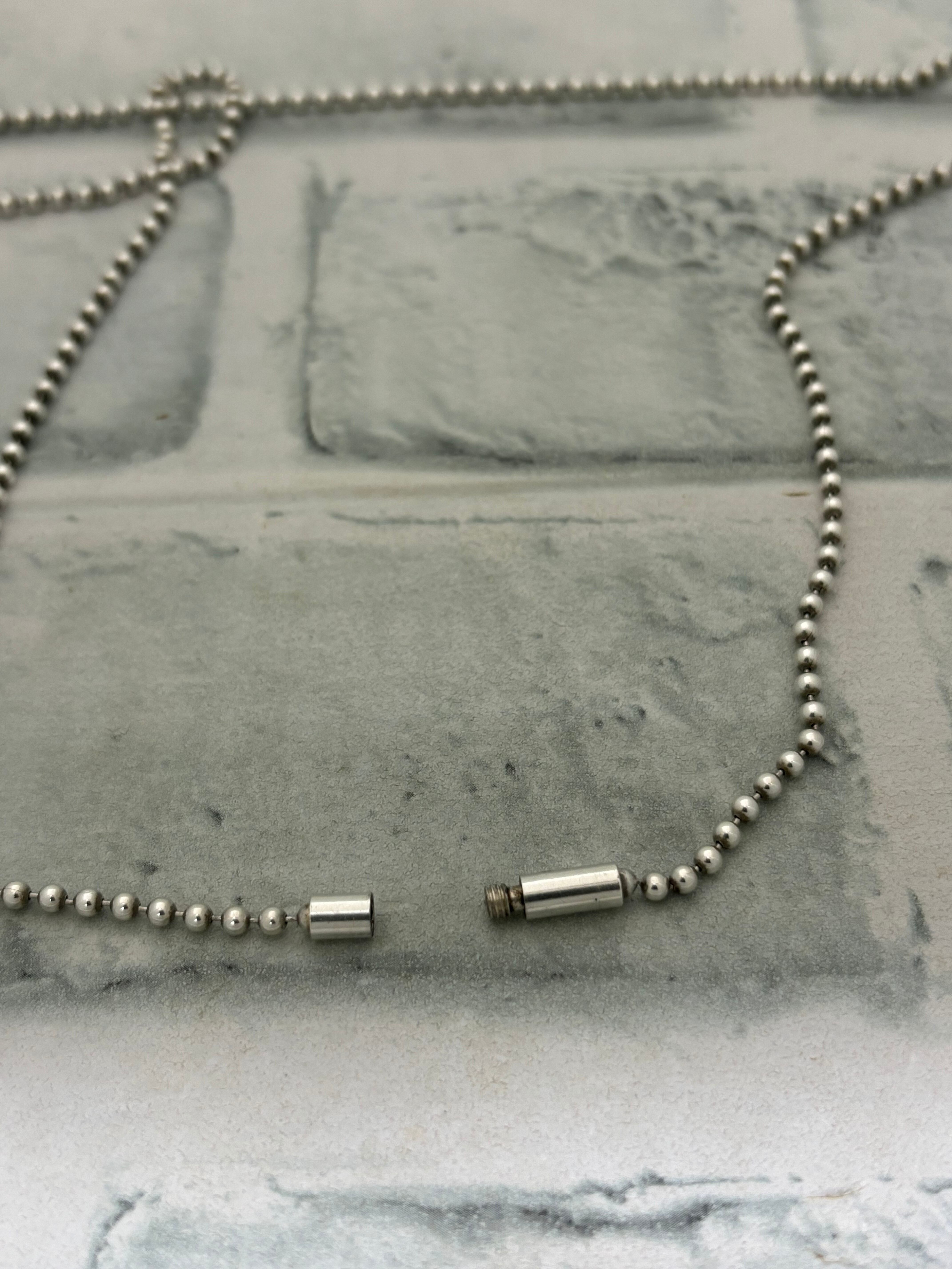 ミリタリーアイテムのドッグタグをモチーフにしたネックレス。本来、所持者の個人情報が記載される部分にはロゴが刻印されています。