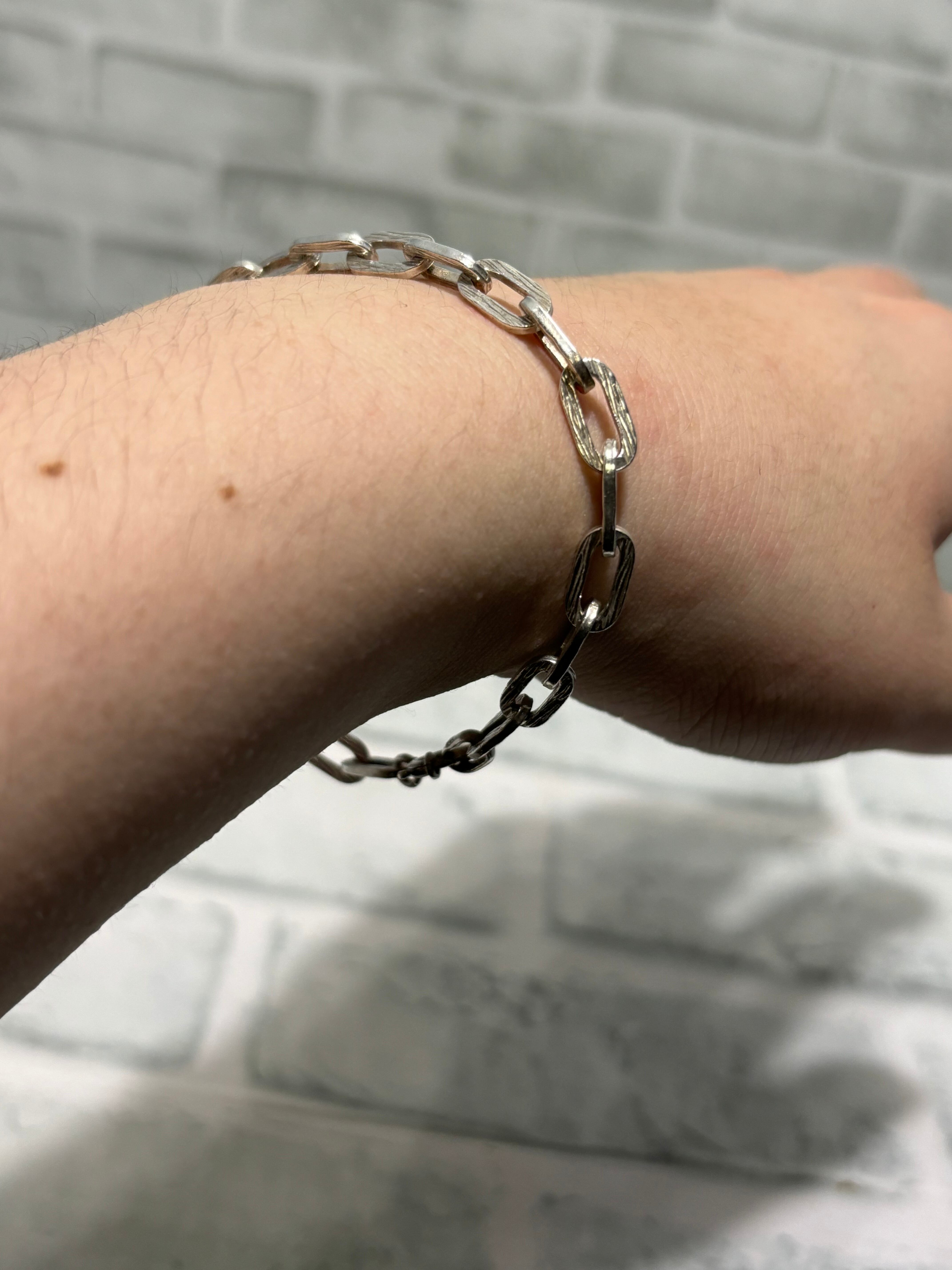 横長のリンクチェーンデザインが特徴的なエリプスチェーンを採用したブレスレット。木目を思わせる装飾が施されたデザイン性の高いアイテムです。