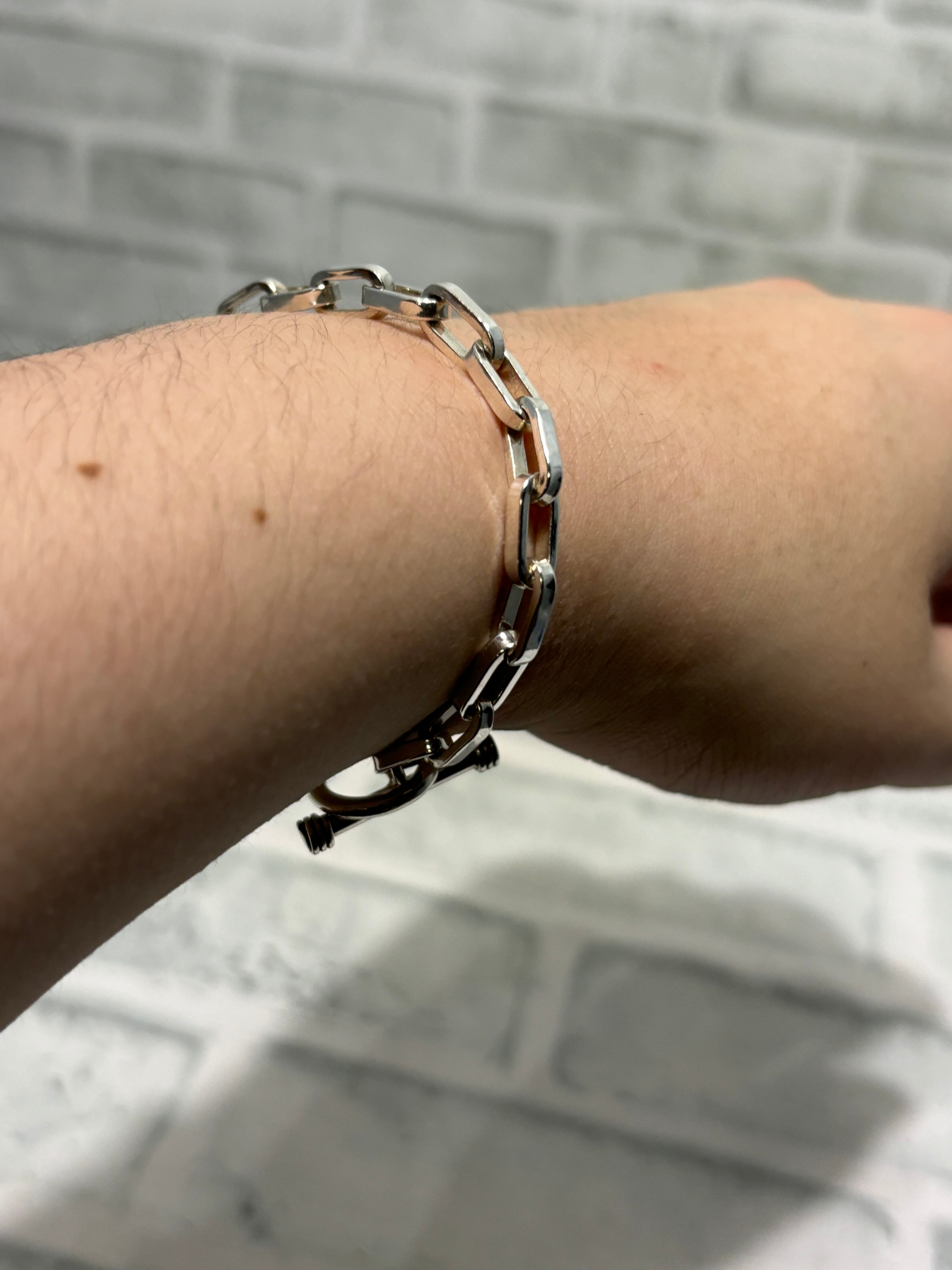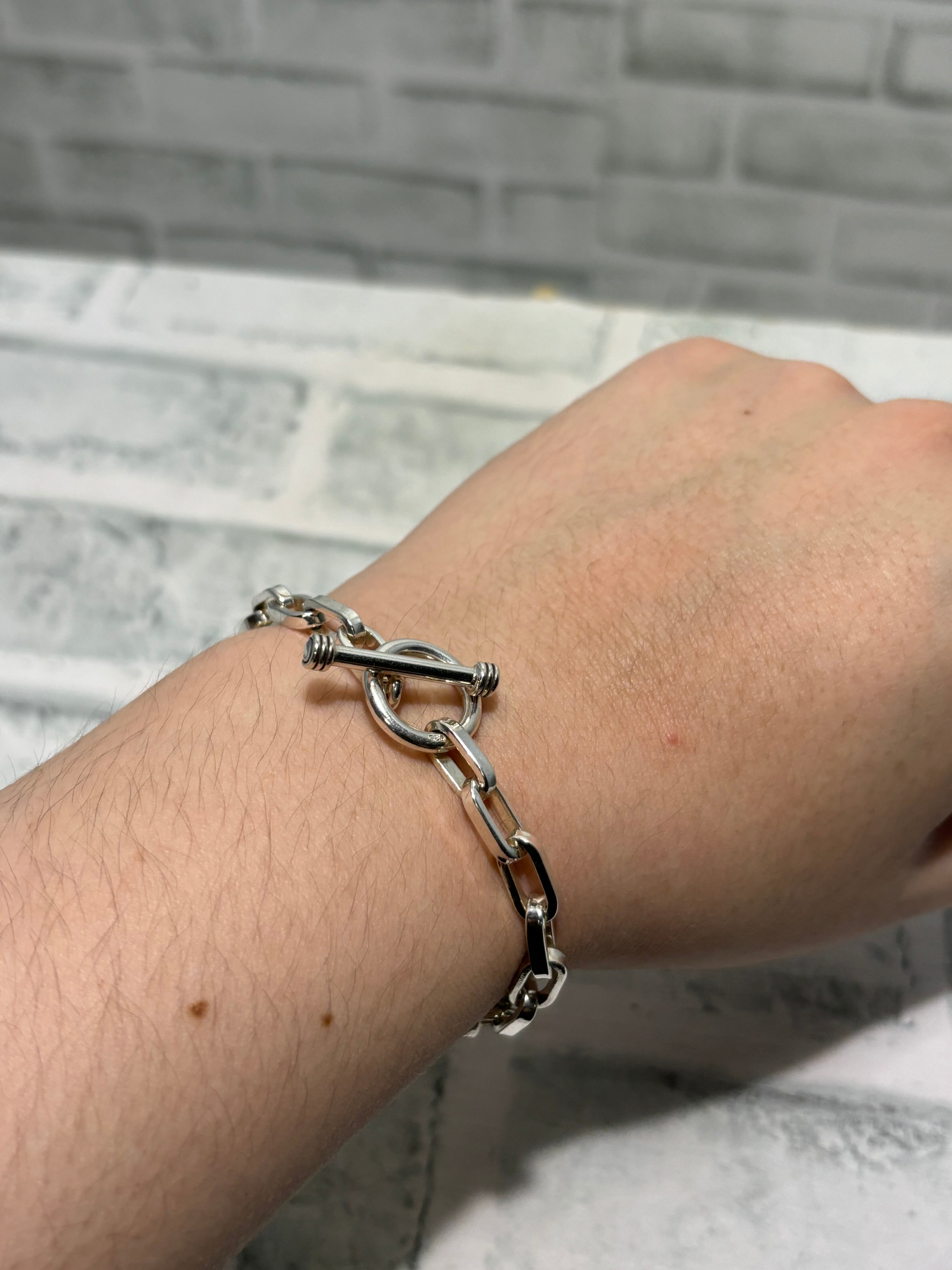 横長のコマを使用したリンクデザインのエリプスチェーンを採用したブレスレット。金具には着脱が楽なトグル金具が使用されています。