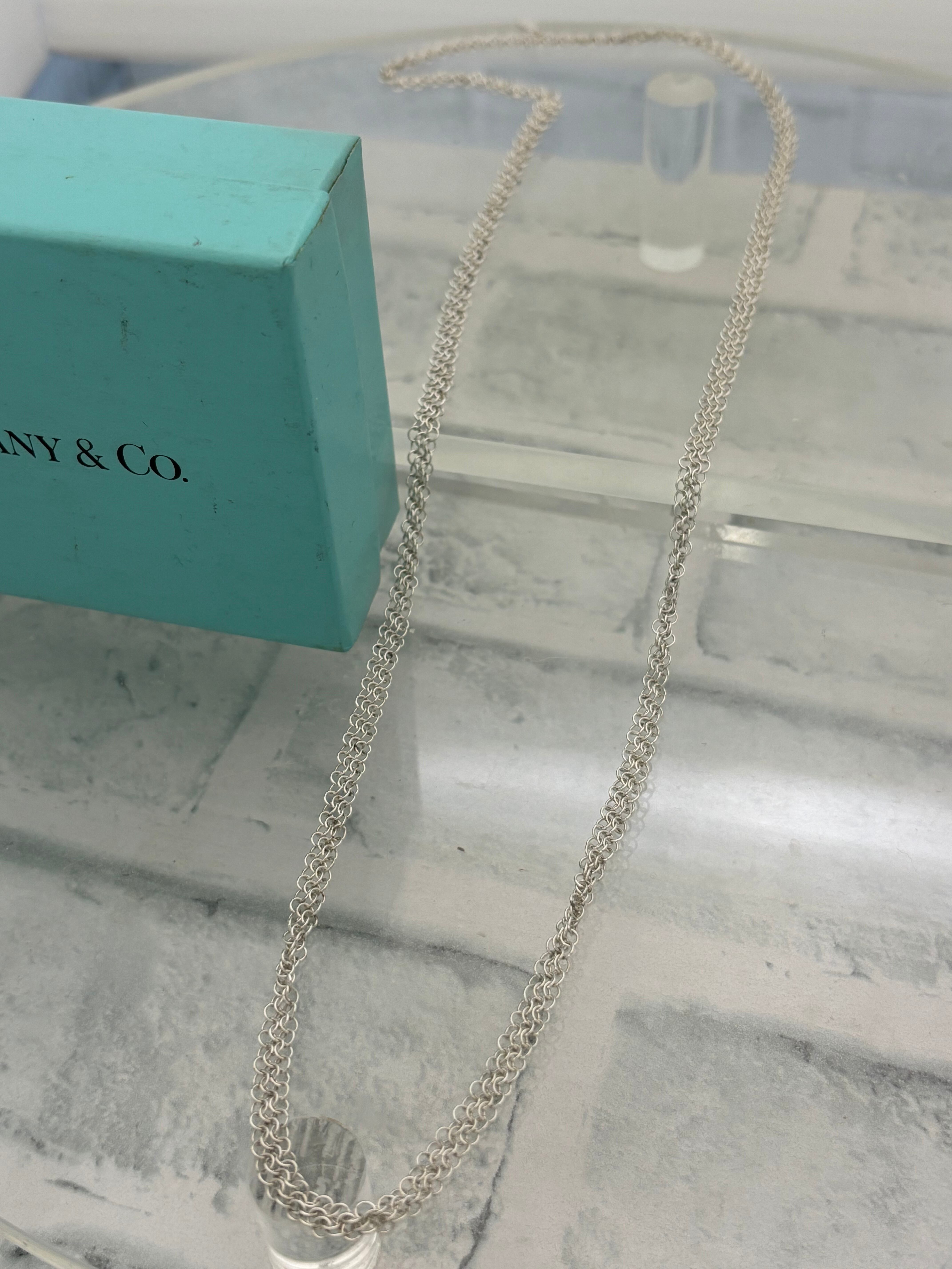 今は亡きティファニーを代表するデザイナー、エルサペレッティの作品。このメッシュチェーンは小さいチェーンのコマを一つ一つ職人が繋ぎ合わせた技術力が分かるアイテムです。